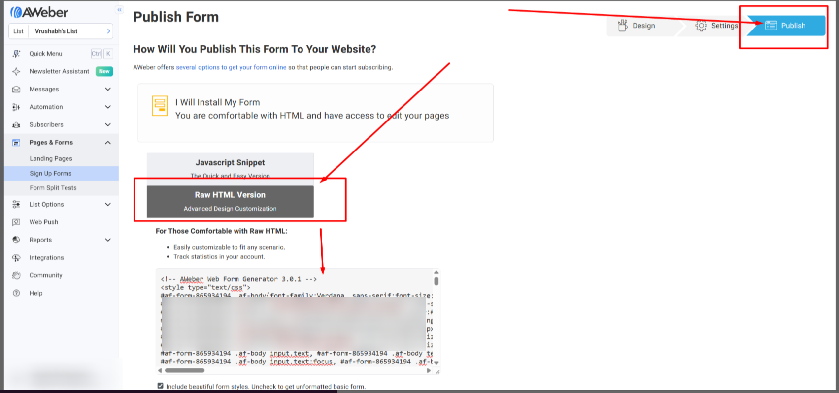 On the last step of the form, click on "Publish option" and copy the HTML code.