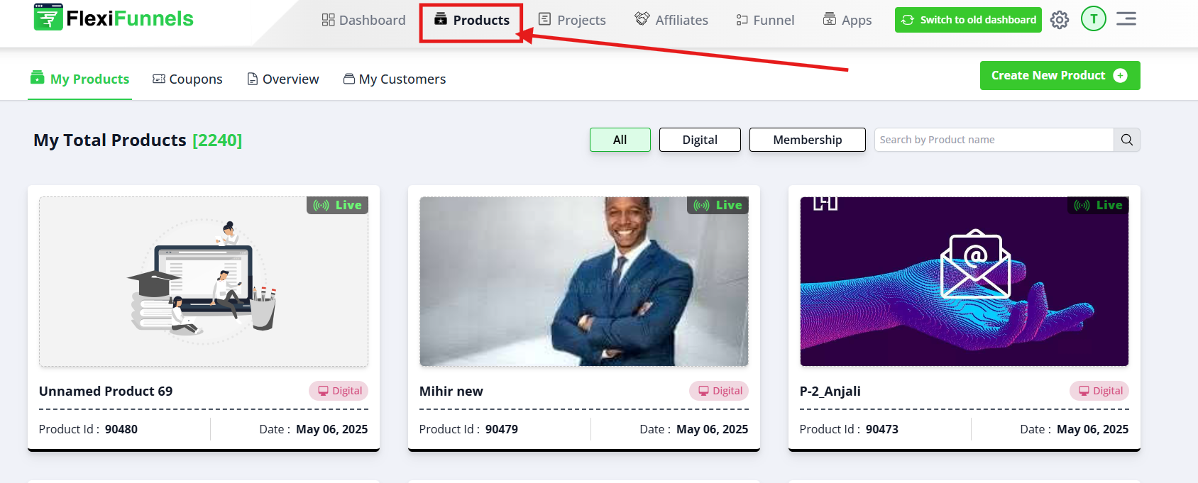 Click on "Projects” displayed on the FlexiFunnels Dashboard Screen.