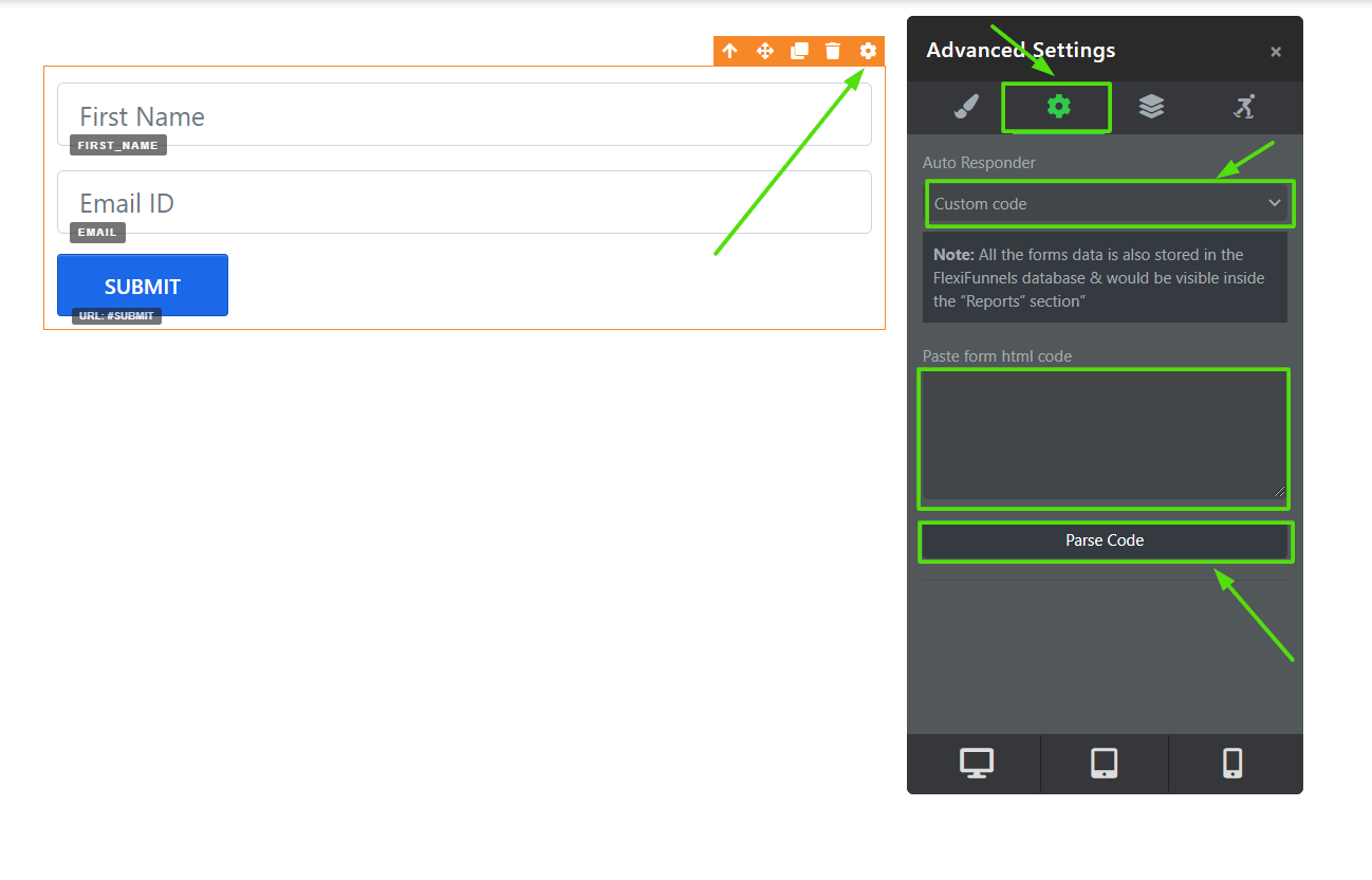 Once a “form” element is imported into the FlexiFunnels editor, click on the “form” element gear icon settings to open the form element gear settings