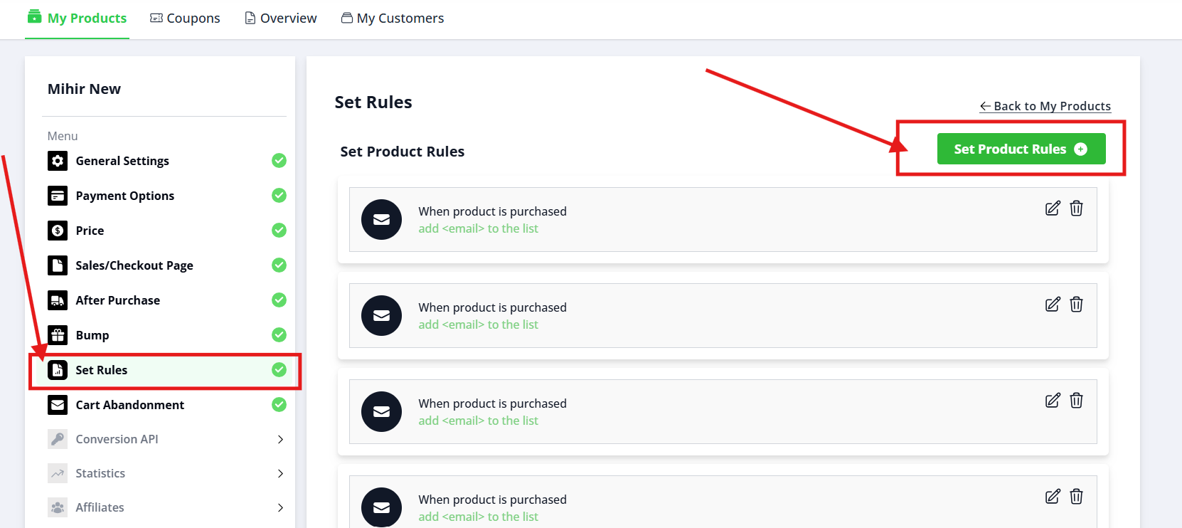 - In the product settings menu on the left side, click on the "Set Rules" option.