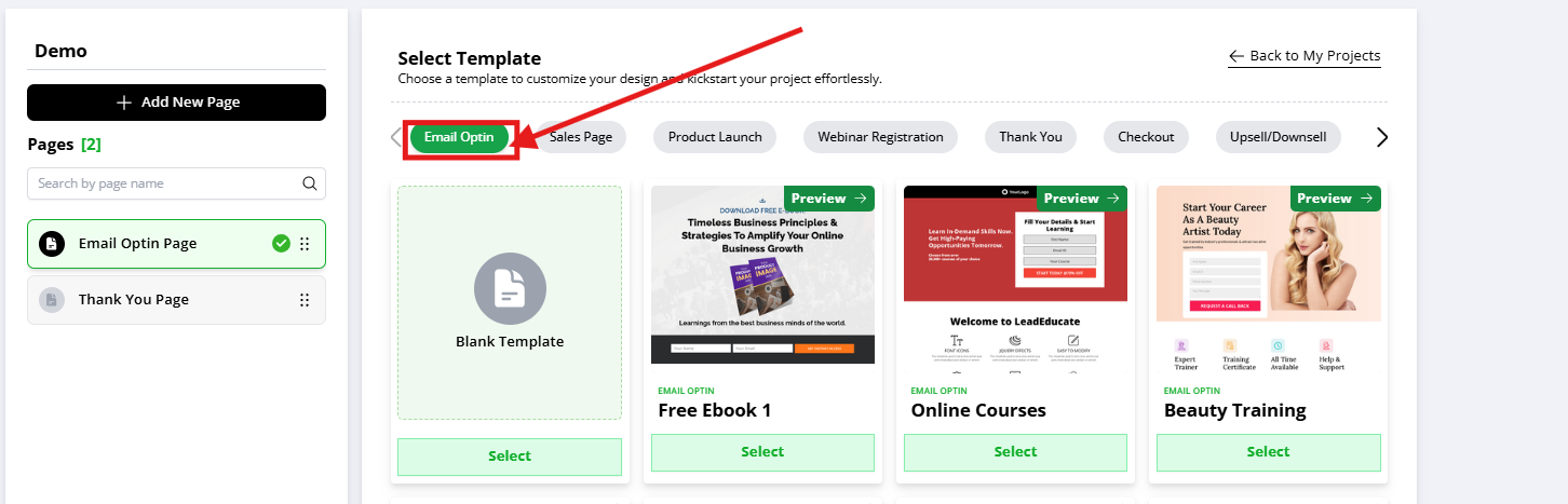 Then select the preferred template for your landing page