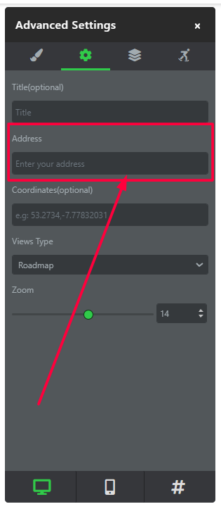 4. After clicking on the settings of the Map element, the popup opens, and there you can click on the advanced settings for the Map element.