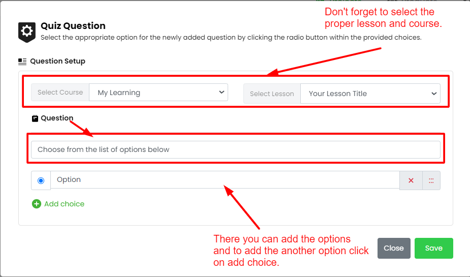 • Click on "Quiz Questions" and choose the specific course and lesson where you want the quiz to appear.