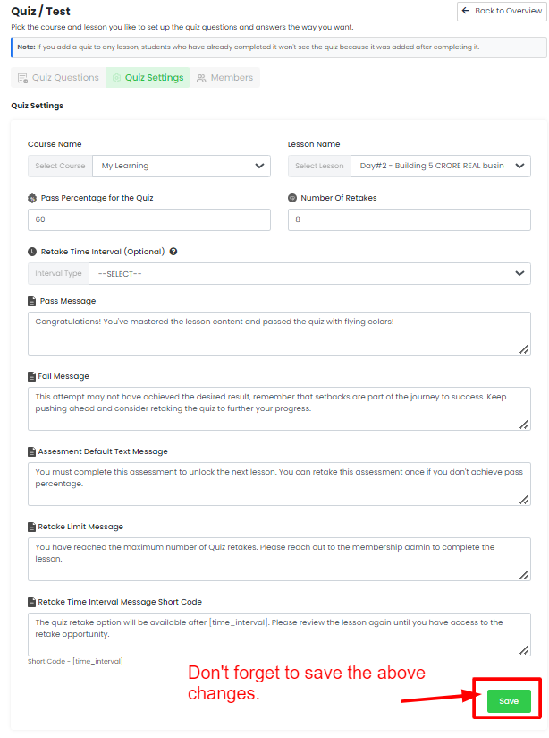 • Retake Time Interval Message Shortcode: Here, you can add a message indicating the time until the next retake is available after a user's previous attempt.