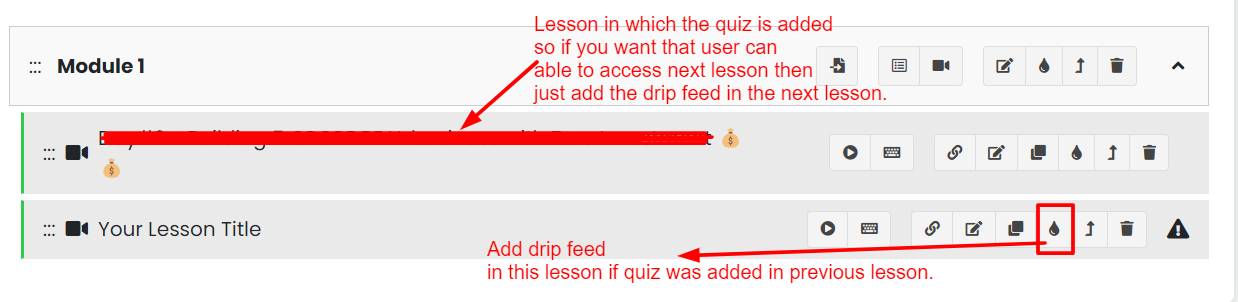 • If you want users to complete the quiz before accessing the next lesson, you can enable "Drip Feed" on the desired lesson.