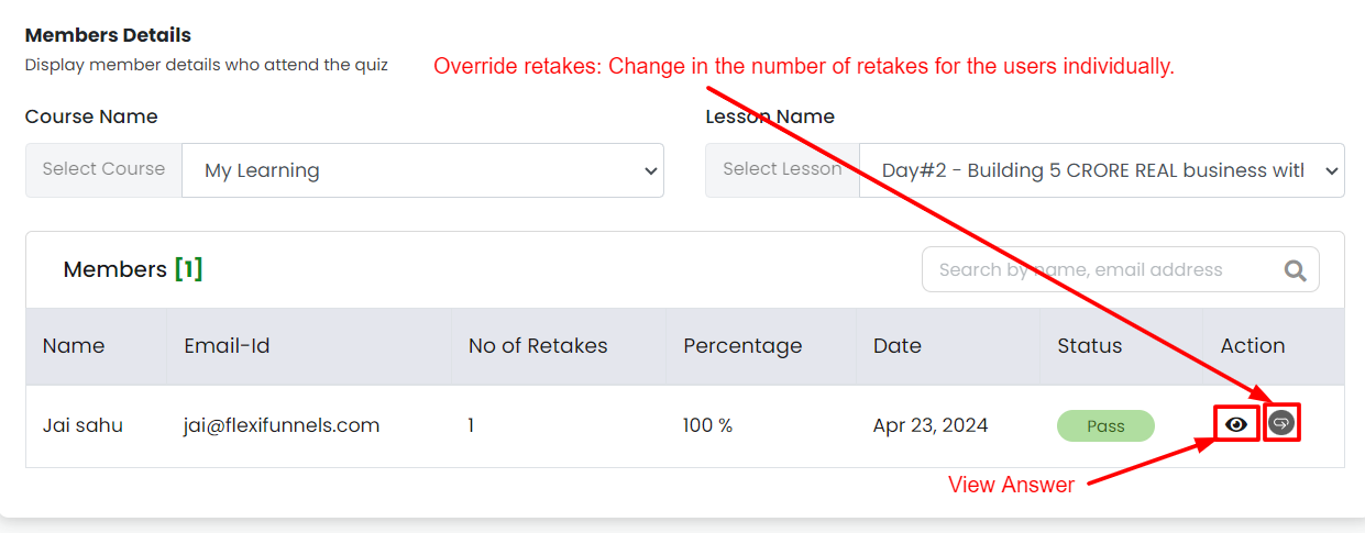 • Members: This section lets you monitor user performance on the quiz, including details like names, scores, and retake attempts.