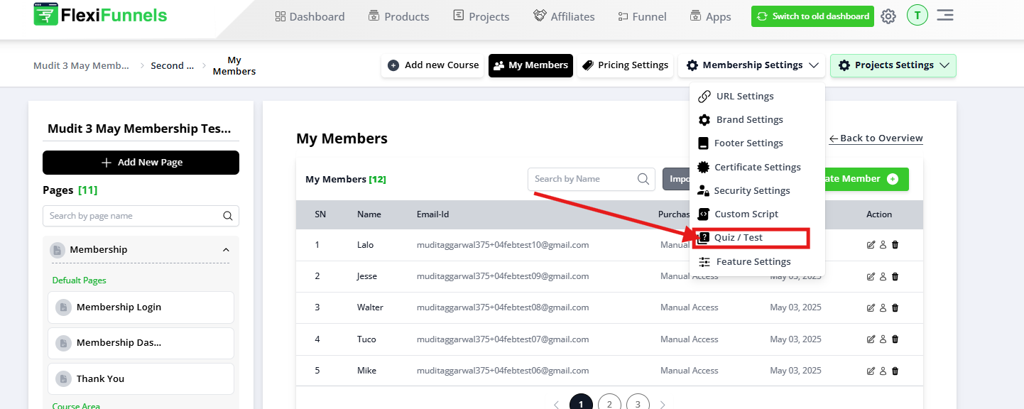 By following the above steps, you can set up a Quiz/Test in your membership project.