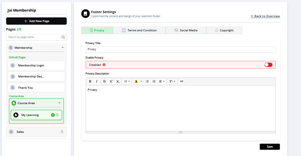• Toggle this ON to activate the privacy section in the footer.