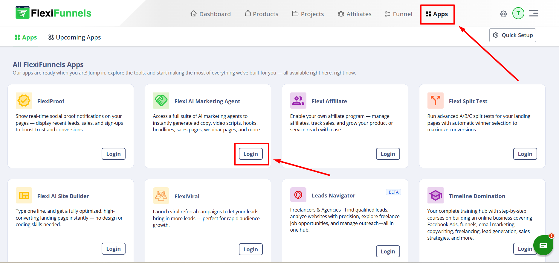 Go to the "Apps" section inside your FlexiFunnels dashboard.