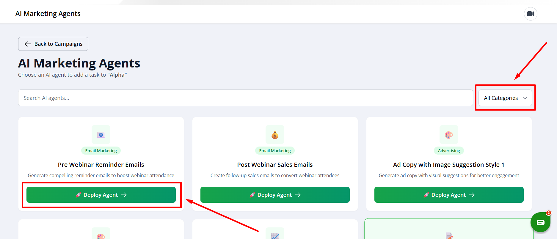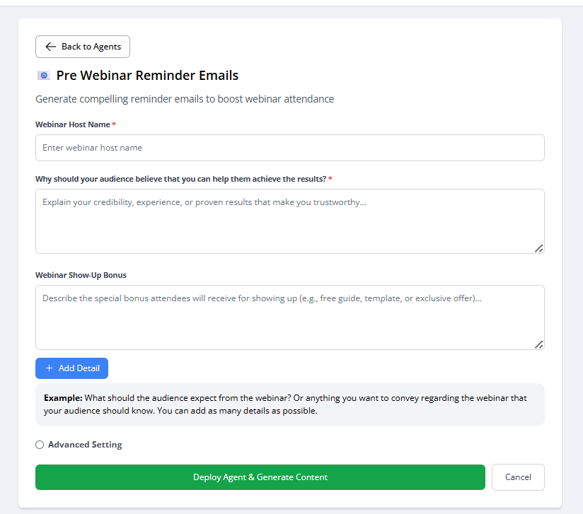Set up your Deploy Agent & Generate Content campaign by adding: