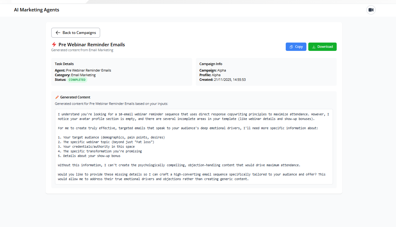 Once you’ve filled in the Deploy Agent & Generate Content campaign details, you will get the Output of the generate content section.