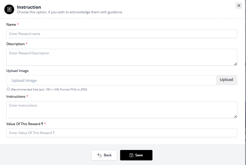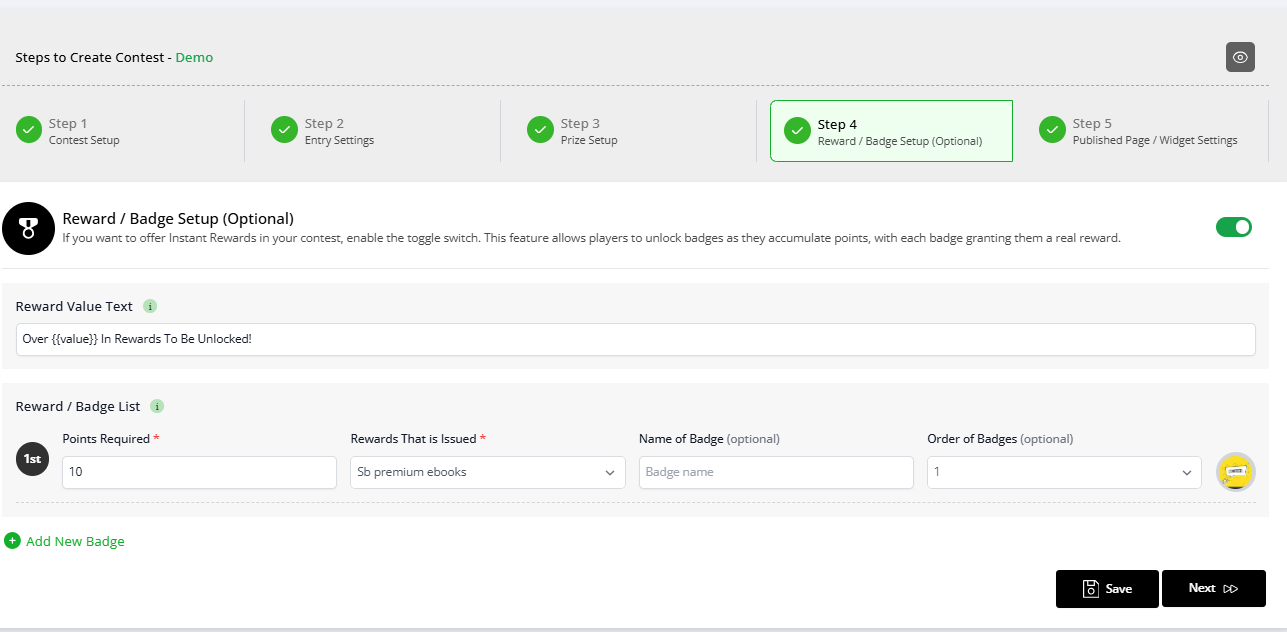 Set Points Required, reward, badge name, display order, and upload badge image.