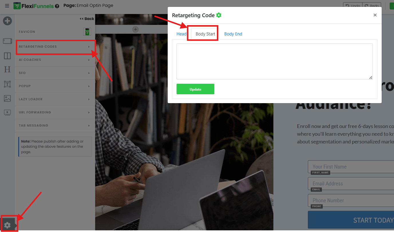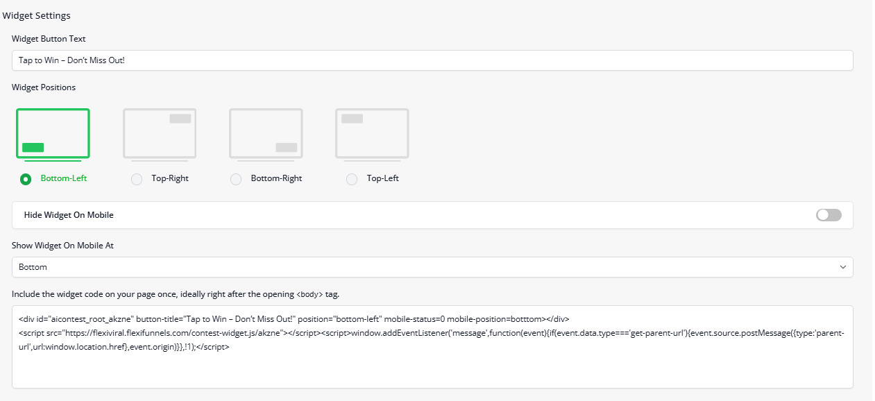 Widget Code: Choose position (Bottom-Left, Top-Right, etc.), then paste the code into your page’s retargeting code (body start).