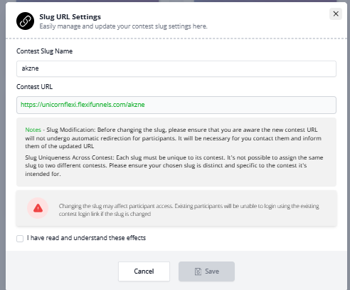 Notes - Slug Modification: Before changing the slug, please ensure that you are aware the new contest URL will not undergo automatic redirection for participants. It will be necessary for you contact them and inform them of the updated URL