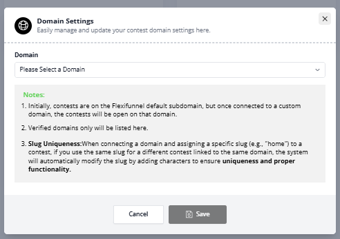 Slug Uniqueness Across Contest: Each slug must be unique to its contest. It's not possible to assign the same slug to two different contests. Please ensure your chosen slug is distinct and specific to the contest it's intended for.