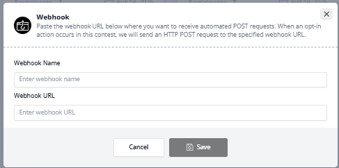 Paste the webhook URL below where you want to receive automated POST requests. When an opt-in action occurs in this contest, we will send an HTTP POST request to the specified webhook URL.