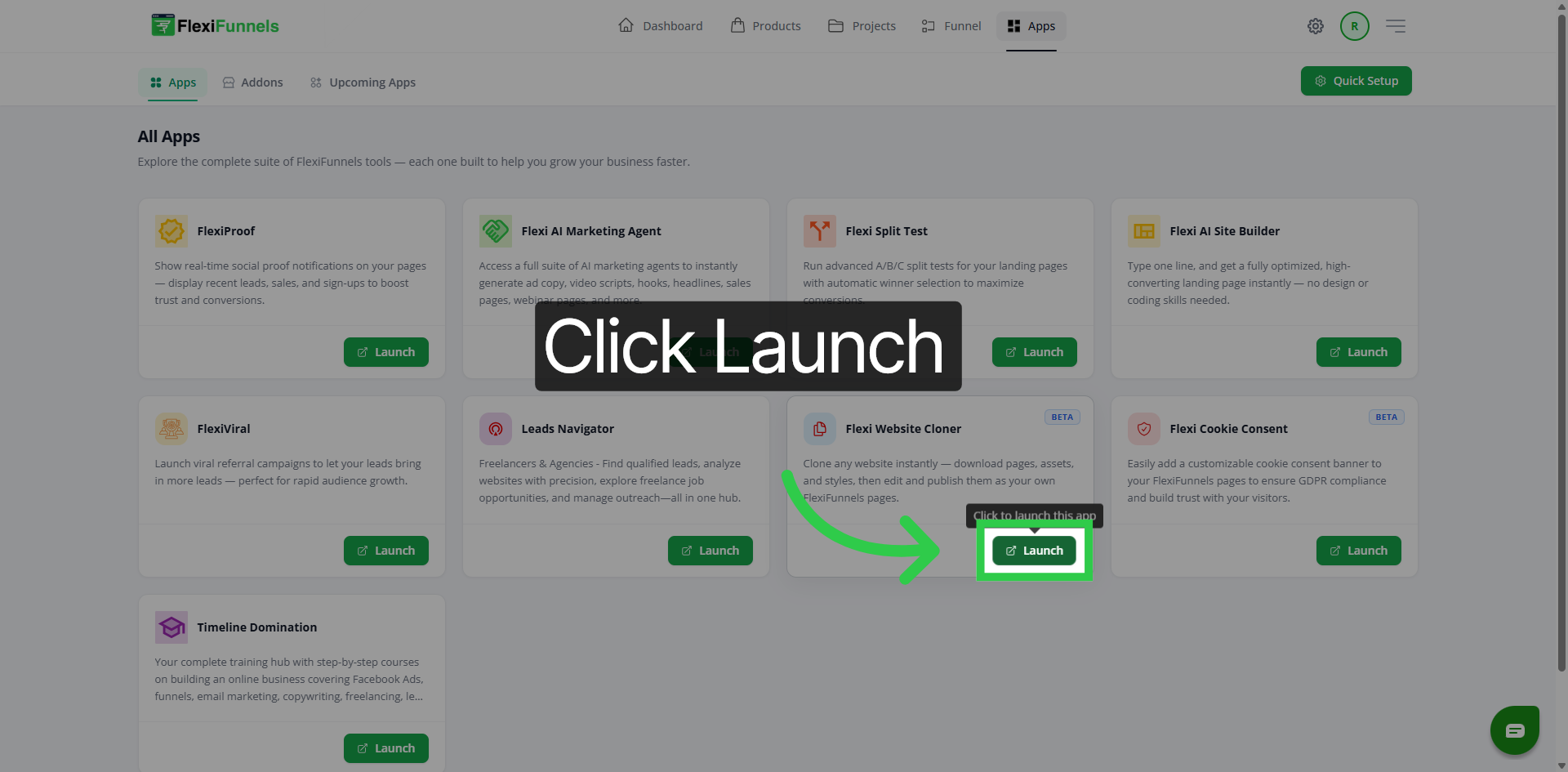 Click “Launch” to start the website cloner application in FlexiFunnels.