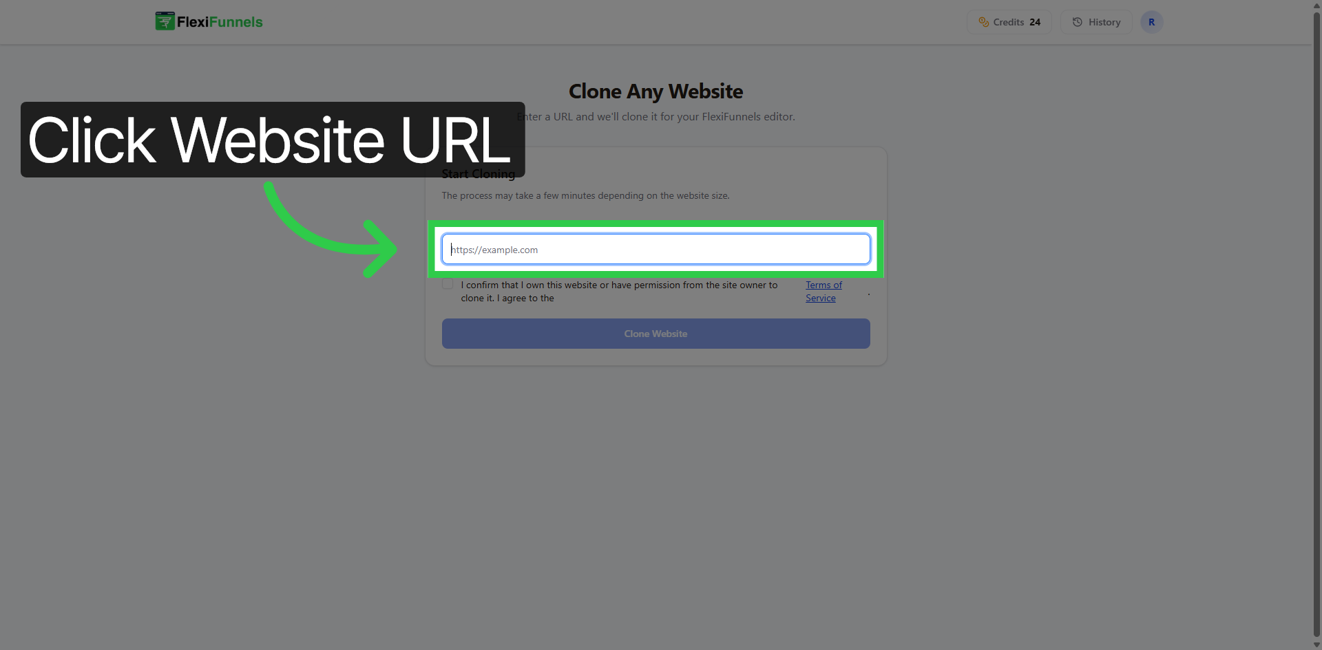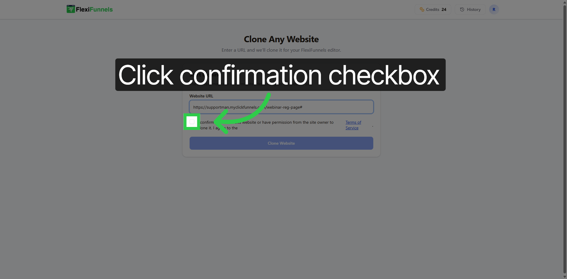 Click the checkbox confirming that you own the website or have permission to clone it and agree to the Terms of Service.