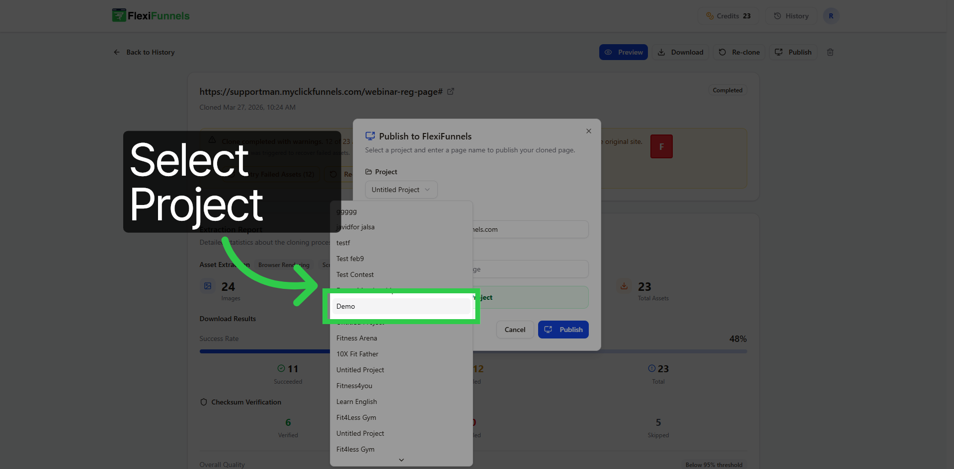 Select the project where you want to publish the cloned website.