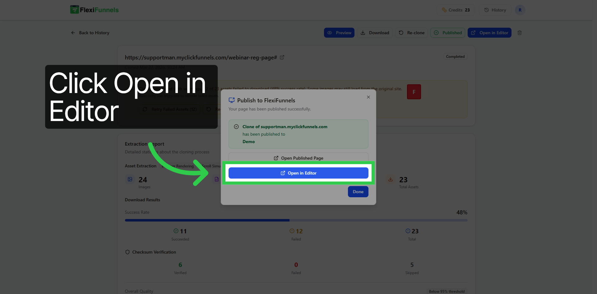 Click “Open in Editor” to start editing your cloned website within FlexiFunnels.